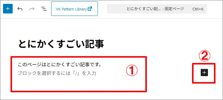 ②埋め込みたい場所で「+」ボタン(ブロックを追加)