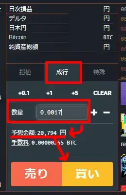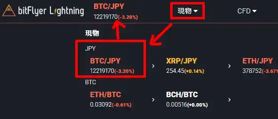 現物⇒BTC/JPYを選択(左上がBTC/JPYになる)