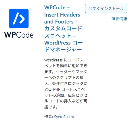[プラグイン] > [新規追加] で 「WPCode」 というプラグインを検索してインストール・有効化します。