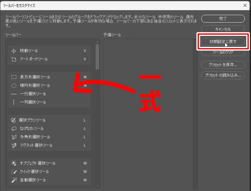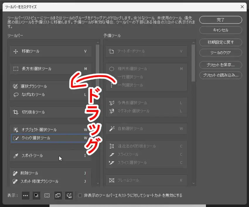 「①」をやると、下図のようなウィンドウが開く。右(予備ツール)を左(ツールバー)にドラッグすればいいのだが、1つ1つやるのはめんどくさい。そこで