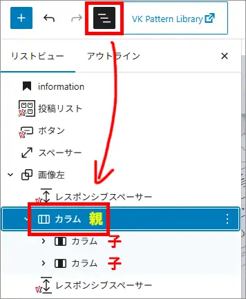 まずは、編集ページの上「三本線」⇒ブロックのツリーを表示⇒該当ブロックの「親カラム」を選択(その中に子カラムが2つあるので間違えないように)